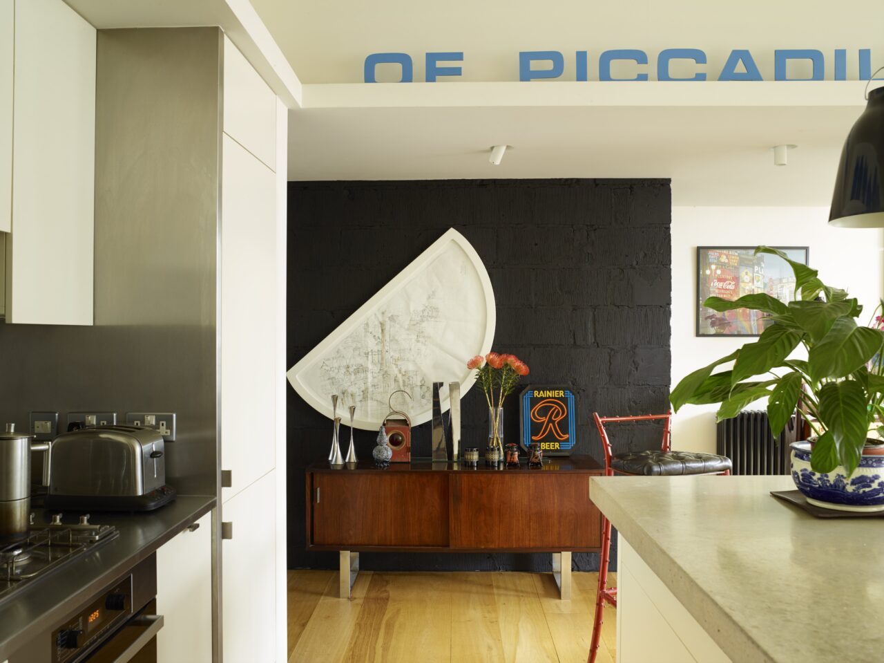 A canopy detail wraps around the kitchen hiding a staircase bulkhead in the adjacent flat. On this rests a backlit sign from the late Baron of Piccadilly menswear shop.